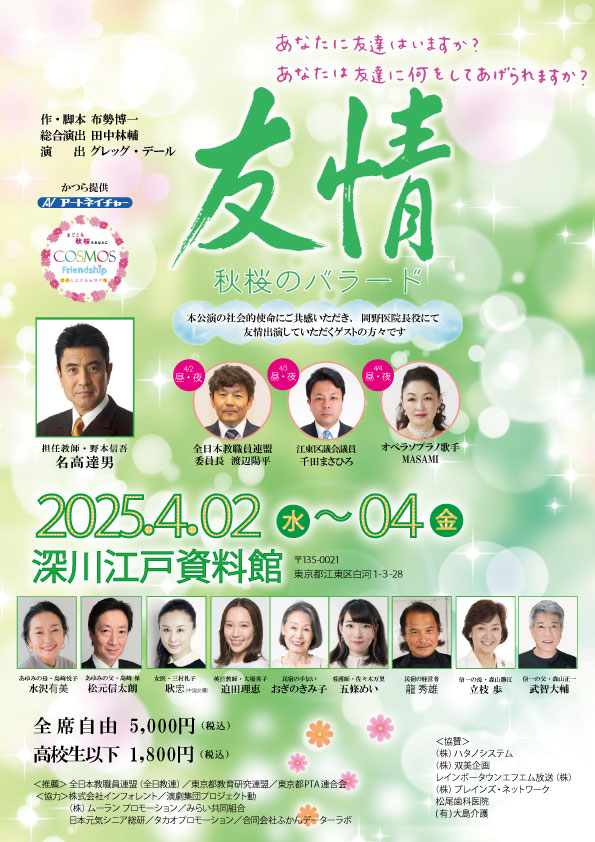 このたび、合同会社ふかんデータラボは、劇団絵生が上演する演劇「友情~秋桜のバラード~」の成功に向けて、以下のサポートをさせていただきました。